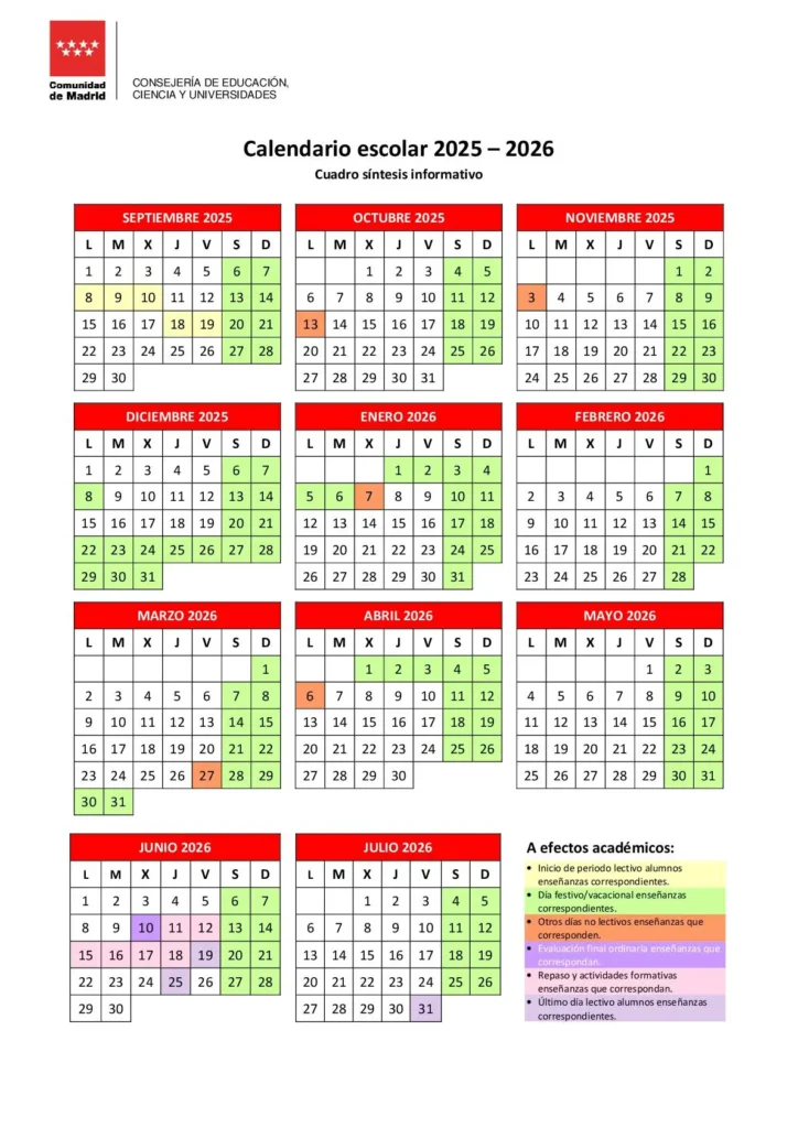 - A este calendario hay que añadir los días de fiesta de ámbito local que haya determinado cada municipio y así aparezcan publicados en el BOCM para los años 2025 y 2026.